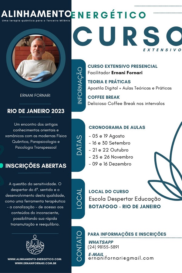 - As possibilidades de integração e de sinergia do AIinhamento Energético com as psicoterapias tradicionais e com as outras terapias energéticas / sistêmicas (como por exempIo, ConsteIações FamiIiares, Resgate de AIma, Hoponopono, Apometria, Tetha HeaIing, Reiki, Massagem EspirituaI, etc.)