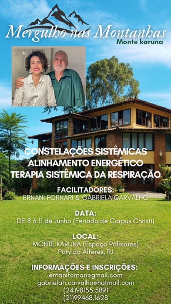 Teremos práticas terapêuticas vivenciais de Alinhamento Energético, Constelações Sistêmicas e Terapia da Respiração.